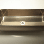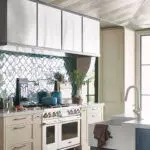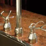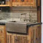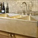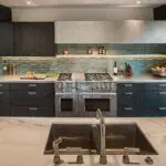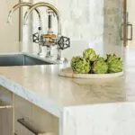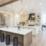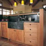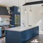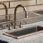 Olympus cabinet pulls (CK359) and Olympus grips (G661) shown in silicon bronze, dark lustre patina. The Alpha pendant (PE455) with custom glass, custom socket covers, custom bulbs shown in silicon bronze, dark lustre patina. Kitchen Deck Mount faucet (DMF) with Arched spout (P700) with the Cross knobs (K235) and the Quadra sink (SK422) shown in white bronze, light patina.