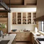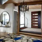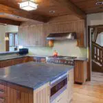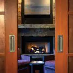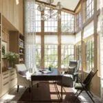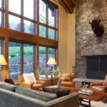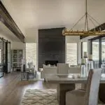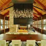 Refined craftsmanship can be found in every corner of this Jackson Hole home, from the floor-to-ceiling windows to the steel-clad fireplace. Working with a muted pallette, this remodeled house weaves together a cozy, masculine look with various textures of stone and tile. Stunning accent pieces including a glass chandelier and cherry wood cabinets create a welcome home for Rocky Mountain Hardware cabinetry and door sets throughout.Architect: Howells Architecture + Design
