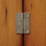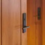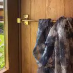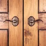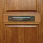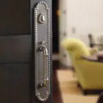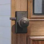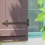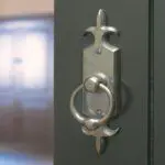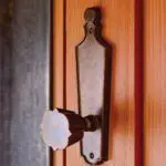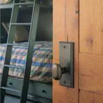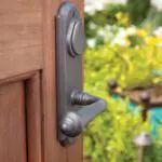 Gate latch used on a screen door, with the Rectangular escutcheon (E414) and Mini Roswell knob (K211), shown in silicon bronze, dark patina.