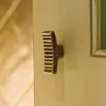 Flute thumblatch escutcheon (G130) with the Flute grip (G10075) shown in white bronze, light patina. Shown with the Designer Textures Doorbell button (DBB-E103) in white bronze, light patina with the brown weave leather.