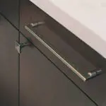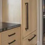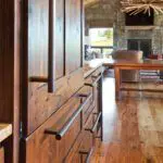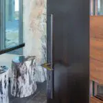 A stunning picture window overlooking the East Fork Wood River and a modern glass wine cellar are just a few of the notable highlights inside this East Fork, Idaho remodel. The homeowner, who had fallen in love with the secluded location was drawn to our handcrafted hardware and chose early on in the project to feature Rocky Mountain Hardware prominently. The simple and clean lines of our Metro Collection, punctuated by Rail Grips, are thoughtfully incorporated throughout the home. Each handle and escutcheon is finished with our striking Bronze Dark Luster patina, which demonstrates how a cohesive finish can bring together eclectic design elements. It’s a testament to the organic and perfectly imperfect nature of bronze, and its ability to stand out against a variety of surfaces and color selections. The builder on the remodel was Lee Gilman Builders, the interior designer was Latham Interiors.Designer: Latham Interiors