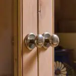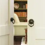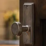 Passage Set with the Ellis escutcheon (E005) and Ellis knob (K075), shown in silicon bronze, light patina.