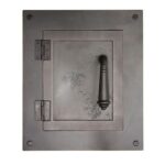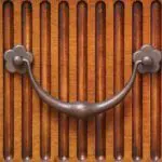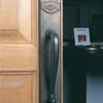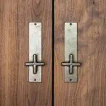 Hammered thumblatch esctucheon (G30432) with the Smith Grip (G30148) shown in white bronze, medium patina.