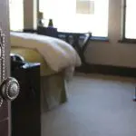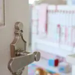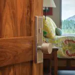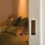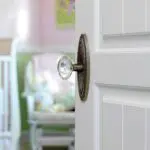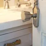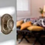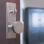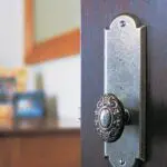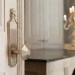 Luna Knob (K207) on Stepped Privacy Mortise Bolt escutcheon (E306) shown in white bronze, light patina.