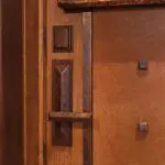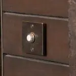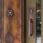Designer Textures thumblatch entry escutcheon (G130) shown with the Rail grip (G261) in silicon bronze, rust and silicon bronze, dark patinas with the Basic texture. Designer Textures Door Bell Button (DBB-E103) shown in silicon bronze, dark patina with the Basic texture.