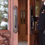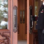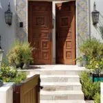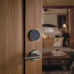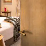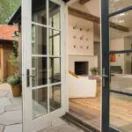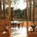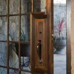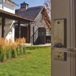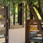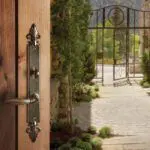 Calistoga Ranch/An Auberge Resort, Napa Valley, CA. Patio set with Curved escutcheon (E530) and Olympus lever (L135), shown in white bronze, medium patina.