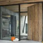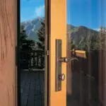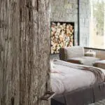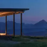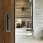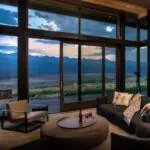 Overlooking the breathtaking Grand Teton Range, this contemporary home mixes the heavy textures of board formed concrete and rusted steel panels with the soft textures of cozy lambskin rugs and buttery leathers. Rocky Mountain Hardware’s Metro collection, shown in silicon bronze, dark lustre patina, marries the modern aesthetics of the home with classic high-country style. Floor-to-ceiling windows also offer guests year-round panoramic views of the stunning landscapes surrounding the cabin.Architect: Pearson Design Group