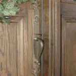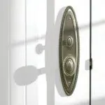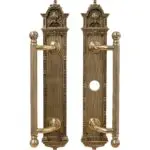 Bordeaux thumblatch escucheon (G30833) with the Chateaux grip (G30187) shown in white bronze, light patina.