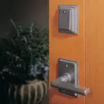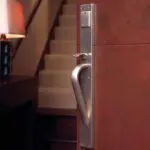 Thumbatch entry set shown with the Weave texture and the Civic Grip (G250). The Weave texture and swing cover are white bronze, medium patina. The frame and grip are white bronze, light patina.