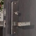 Designer textures thumblatch entry escutcheon (G135) shown with the Rail grip (G254) in white bronze, light patina.