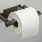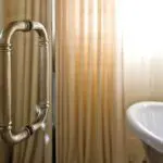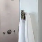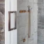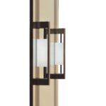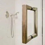 Maddox grip (G580), mounted back-to-back on a plate-glass shower door, shown in silicon bronze, medium patina.