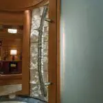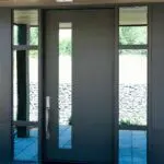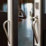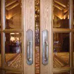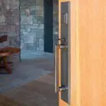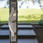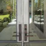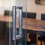 Smith Grip (G30148) mounted back to back on plate glass door, shown in silicon bronze, lustre patina.