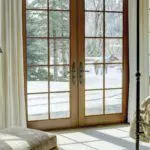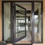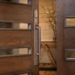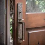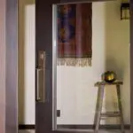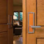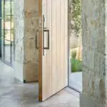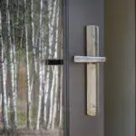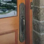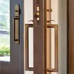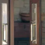 Push/Pull set (G135) shown with the Tuft texture and Summit Grip (G280). The Tuft texture and swing cover are white bronze, light patina and the grip and frame are white bronze, medium patina.