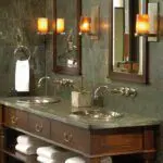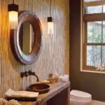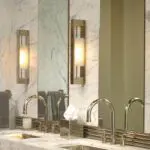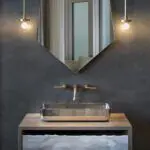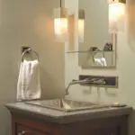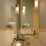 Charlie pendants (PE435) with wall mount faucet (WMF) with Mini Reed levers (LB30), Quadra sink (SK422), 7" towel ring (TR7) and 12" Sash grips (G612) mounted for towel bars, all shown in white bronze, light patina.