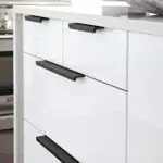 Clean and seamless, this custom-built kitchen marries an organic sophistication with a layered and lovely feel. Complemented by the Rocky Mountain Hardware Catch pulls and Shift Pendants, this space has a high-end custom look. The deep hue of the Hardware contrasting with the high gloss white cabinetry creates a light, fresh space.Designer: CROMA DESIGN