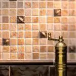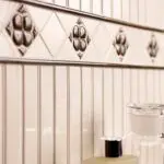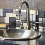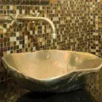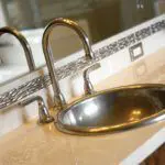 Deck Mount Faucet (DMF) shown with the Small Reed levers (LB30), Gooseneck spout (P603), Small bells (P301) and the Cirque sink (SK218) shown in silicon bronze, light patina. The Water border tile (TT630) shown in white bronze, light patina.