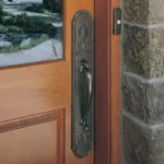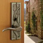 Fleur de Lis Thumblatch entry (G841) shown with the Sun Valley grip (G606) in silicon bronze, light patina.