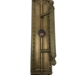 Entry set with a custom escutcheon, the Sun Valley grip (G607) and door bell button with Rectangular escutcheon (EW108). Shown in silicon bronze, medium patina.