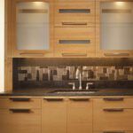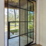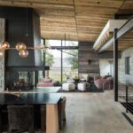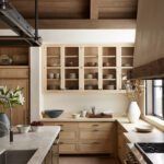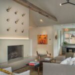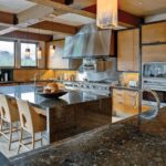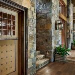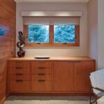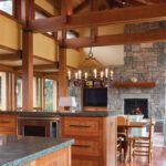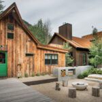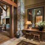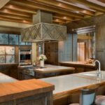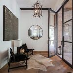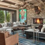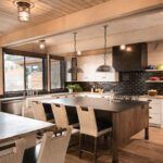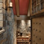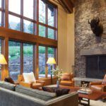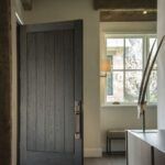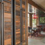 Refined craftsmanship can be found in every corner of this Jackson Hole home, from the floor-to-ceiling windows to the steel-clad fireplace. Working with a muted pallette, this remodeled house weaves together a cozy, masculine look with various textures of stone and tile. Stunning accent pieces including a glass chandelier and cherry wood cabinets create a welcome home for Rocky Mountain Hardware cabinetry and door sets throughout.Architect: Howells Architecture + Design