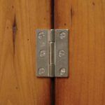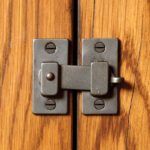 Gate latch used on a screen door, with the Rectangular escutcheon (E414) and Mini Roswell knob (K211), shown in silicon bronze, dark patina.