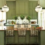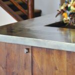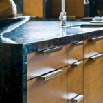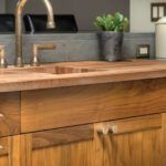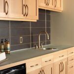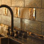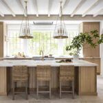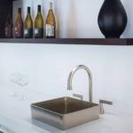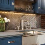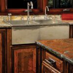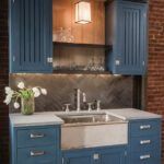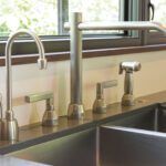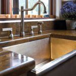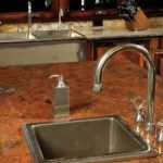 Olympus cabinet pulls (CK359) and Olympus grips (G661) shown in silicon bronze, dark lustre patina. The Alpha pendant (PE455) with custom glass, custom socket covers, custom bulbs shown in silicon bronze, dark lustre patina. Kitchen Deck Mount faucet (DMF) with Arched spout (P700) with the Cross knobs (K235) and the Quadra sink (SK422) shown in white bronze, light patina.