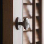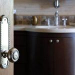 Luna Knob (K207) on Stepped Privacy Mortise Bolt escutcheon (E306) shown in white bronze, light patina.