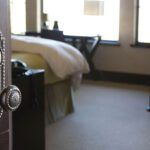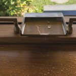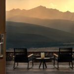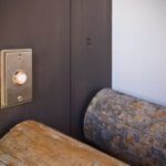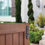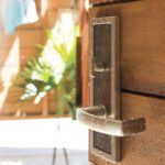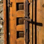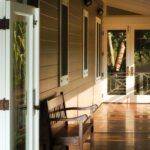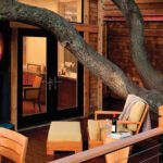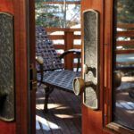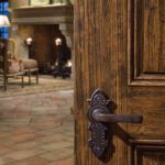 Calistoga Ranch/An Auberge Resort, Napa Valley, CA. Patio set with Curved escutcheon (E530) and Olympus lever (L135), shown in white bronze, medium patina.