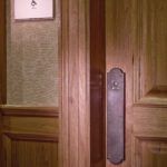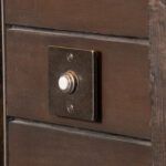 Entry set with a custom escutcheon, the Sun Valley grip (G607) and door bell button with Rectangular escutcheon (EW108). Shown in silicon bronze, medium patina.
