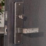 Designer textures thumblatch entry escutcheon (E116) shown with the Longhorn lever (L101) in white bronze, medium and white bronze, dark patinas with the Branch texture.