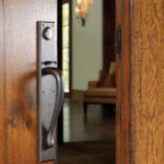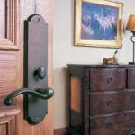 Entry set shown with the Arched escutcheon (E728) and Classic lever (L110), shown in silicon bronze, dark patina.
