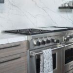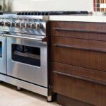 Ribbon and Reed grip (G622) used as a refrigerator pull, shown in white bronze, dark patina.