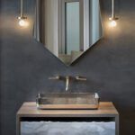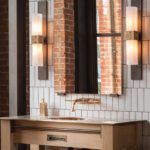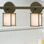 Charlie pendants (PE435) with wall mount faucet (WMF) with Mini Reed levers (LB30), Quadra sink (SK422), 7" towel ring (TR7) and 12" Sash grips (G612) mounted for towel bars, all shown in white bronze, light patina.