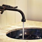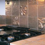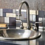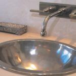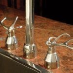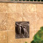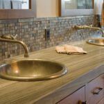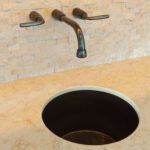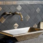 Deck Mount Faucet (DMF) shown with the Small Reed levers (LB30), Gooseneck spout (P603), Small bells (P301) and the Cirque sink (SK218) shown in silicon bronze, light patina. The Water border tile (TT630) shown in white bronze, light patina.