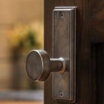 Passage Set with the Ellis escutcheon (E005) and Ellis knob (K075), shown in silicon bronze, light patina.
