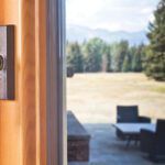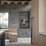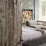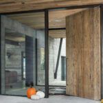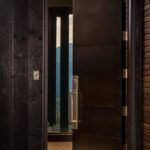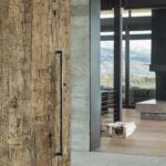 Overlooking the breathtaking Grand Teton Range, this contemporary home mixes the heavy textures of board formed concrete and rusted steel panels with the soft textures of cozy lambskin rugs and buttery leathers. Rocky Mountain Hardware’s Metro collection, shown in silicon bronze, dark lustre patina, marries the modern aesthetics of the home with classic high-country style. Floor-to-ceiling windows also offer guests year-round panoramic views of the stunning landscapes surrounding the cabin.Architect: Pearson Design Group