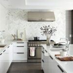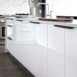 Clean and seamless, this custom-built kitchen marries an organic sophistication with a layered and lovely feel. Complemented by the Rocky Mountain Hardware Catch pulls and Shift Pendants, this space has a high-end custom look. The deep hue of the Hardware contrasting with the high gloss white cabinetry creates a light, fresh space.Designer: CROMA DESIGN