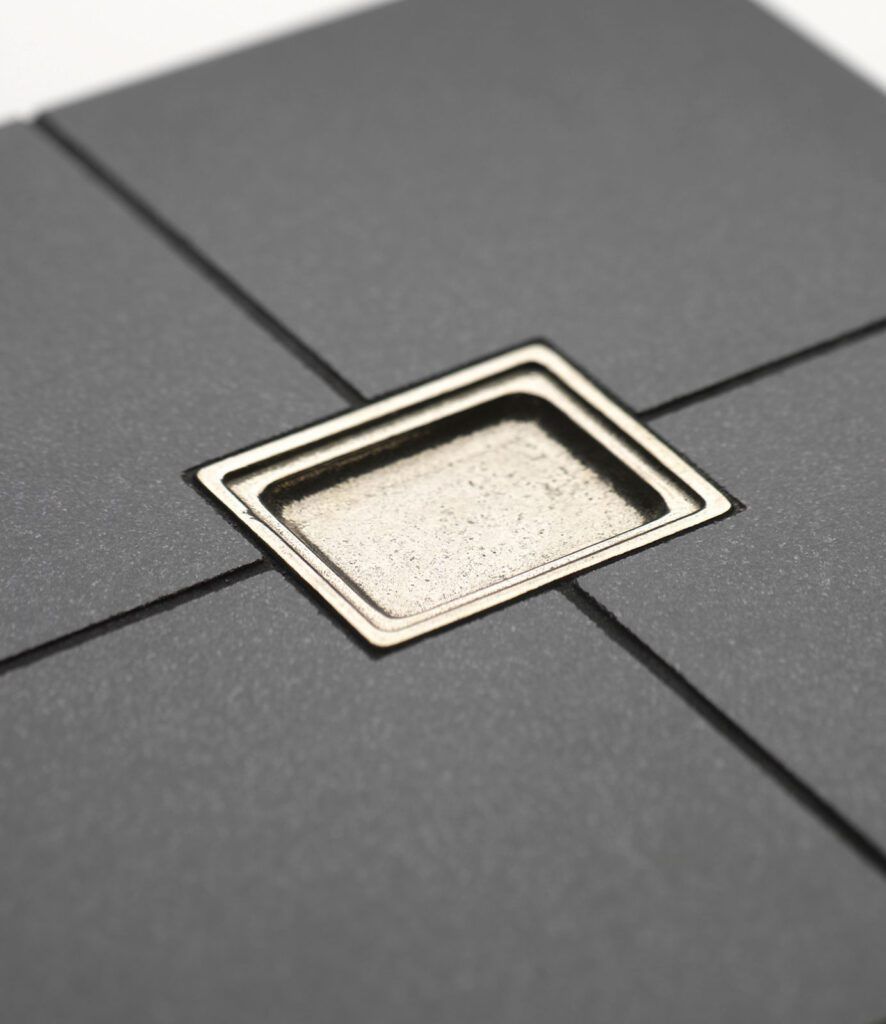 Stepped tile (IP318) shown in white bronze, light patina installed with black granite material.