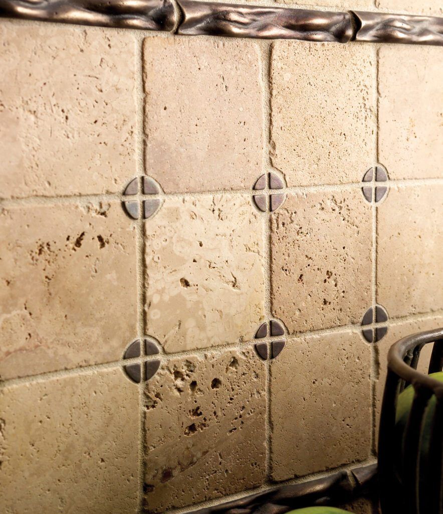 Pinecone tile (TT216) shown in white bronze, dark patina. Shown installed with tumbled travertine material.