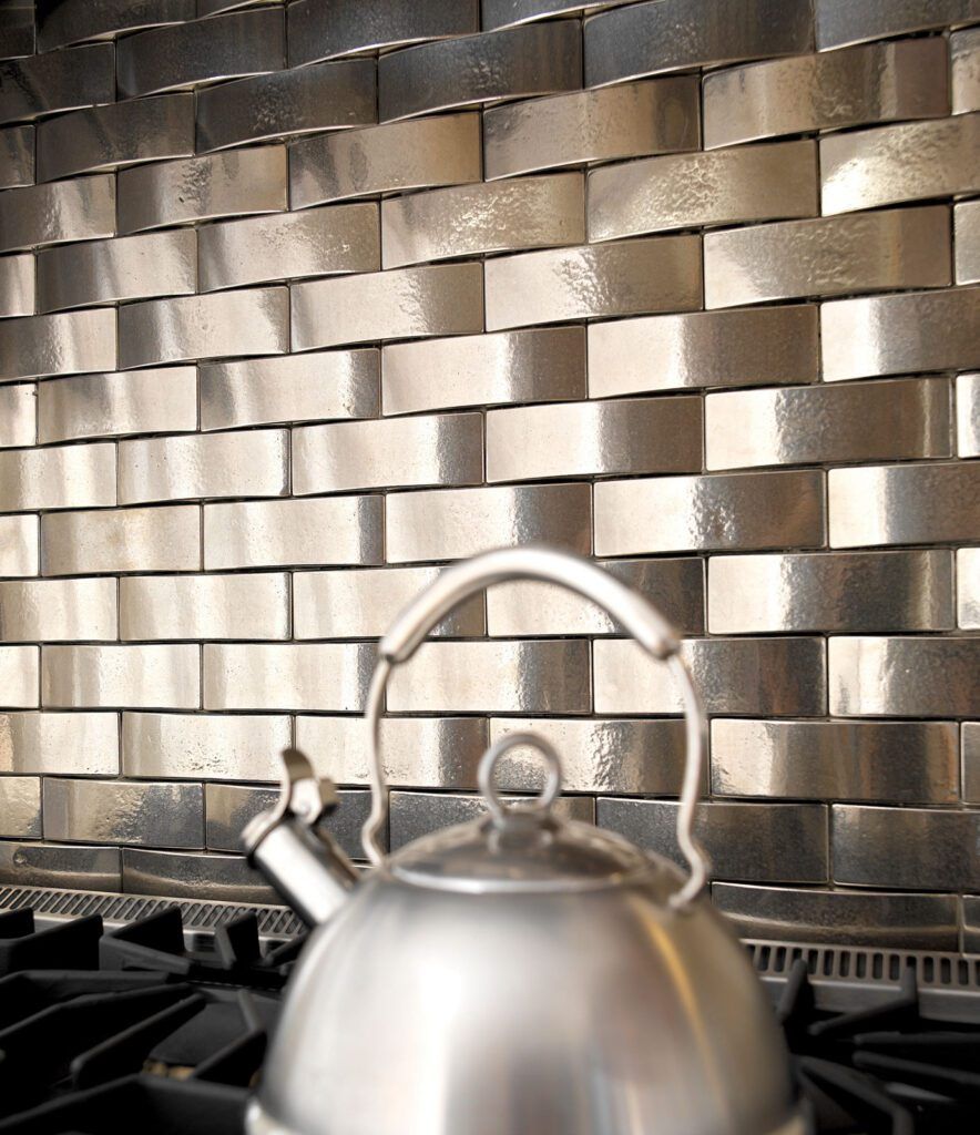 Backsplash features Rivet tiles (TT506, TT640). Shown in white bronze, light patina.
