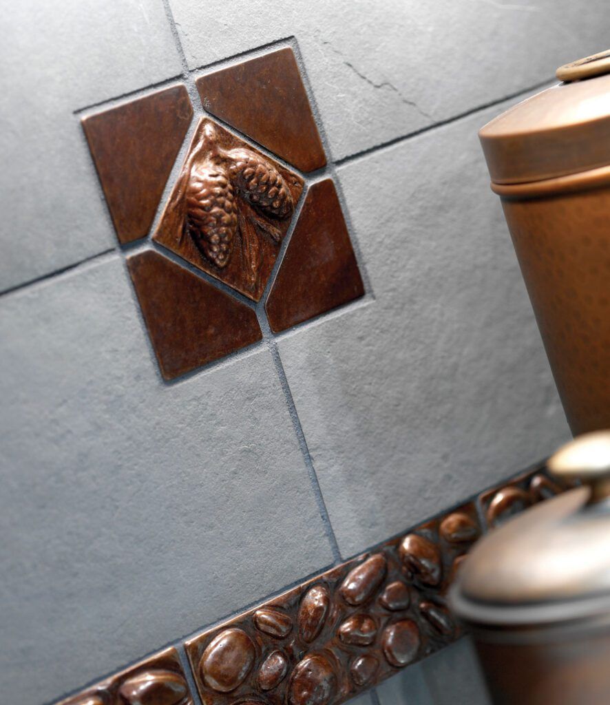 Pinecone tile (TT217) and River Rocks border tile (TT650) both shown in silicon bronze, rust patina.
