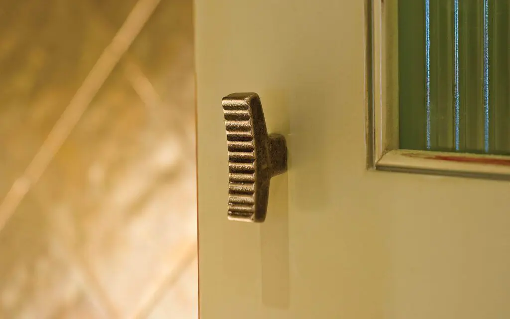 The Empire Bin cabinet pull (CK20311) and the Flute Large Top cabinet knob (CK10015) shown in silicon bronze, light patina.