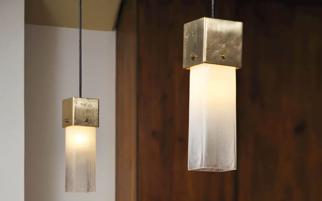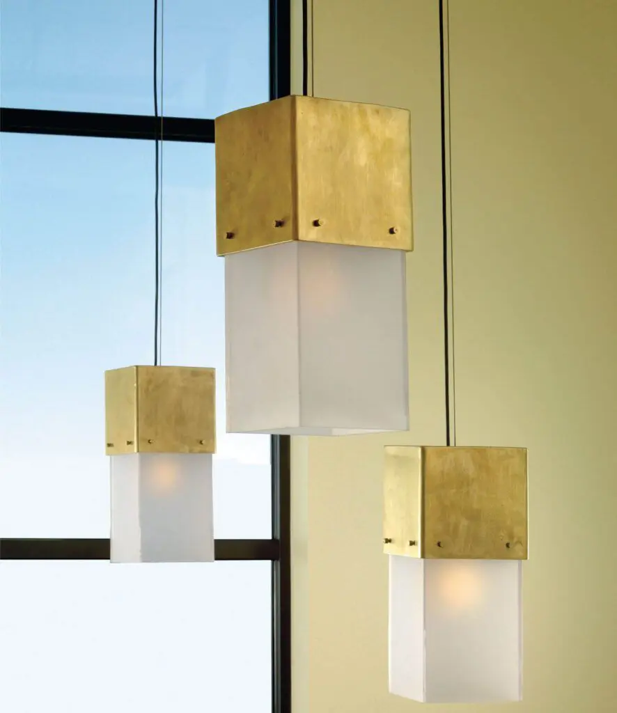 Delta pendants (PE430), shown in silicon bronze, brushed patina.