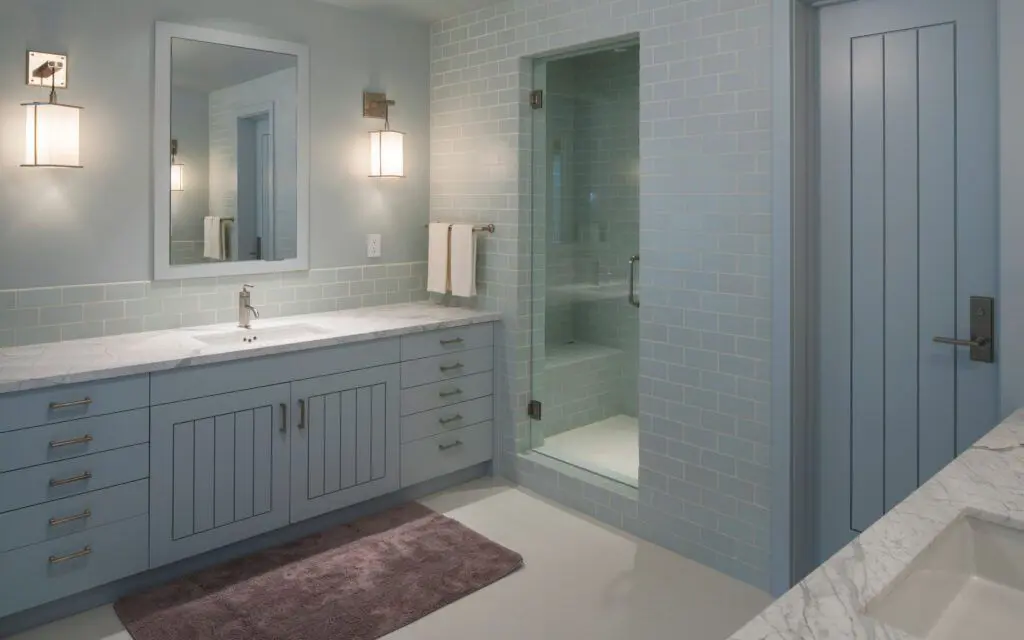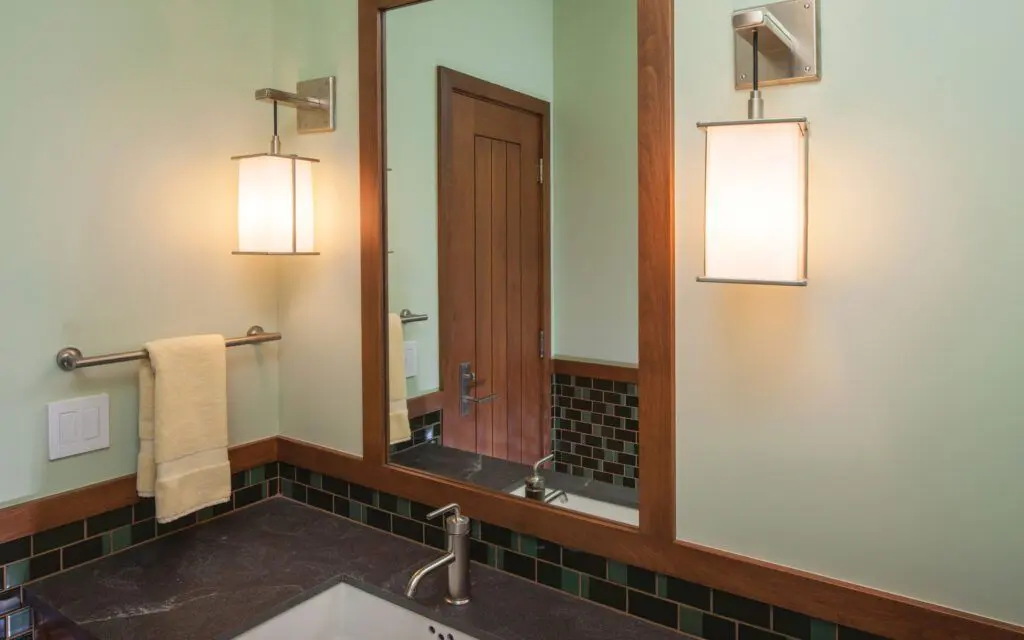 Truss Sconce with Round Glass (WS410) and Rectangular escutcheon (G4513), shown in silicon bronze, light patina. Towel ring (TR6) with the Stepped escutcheon (E300) and the Drop cabinet pull (CK370) with the Oval cabinet rose (CKR60) shown in white bronze, light patina. Ellipse sink (SK319) and the wall mount faucet (WMF) all shown in silicon bronze, light patina.