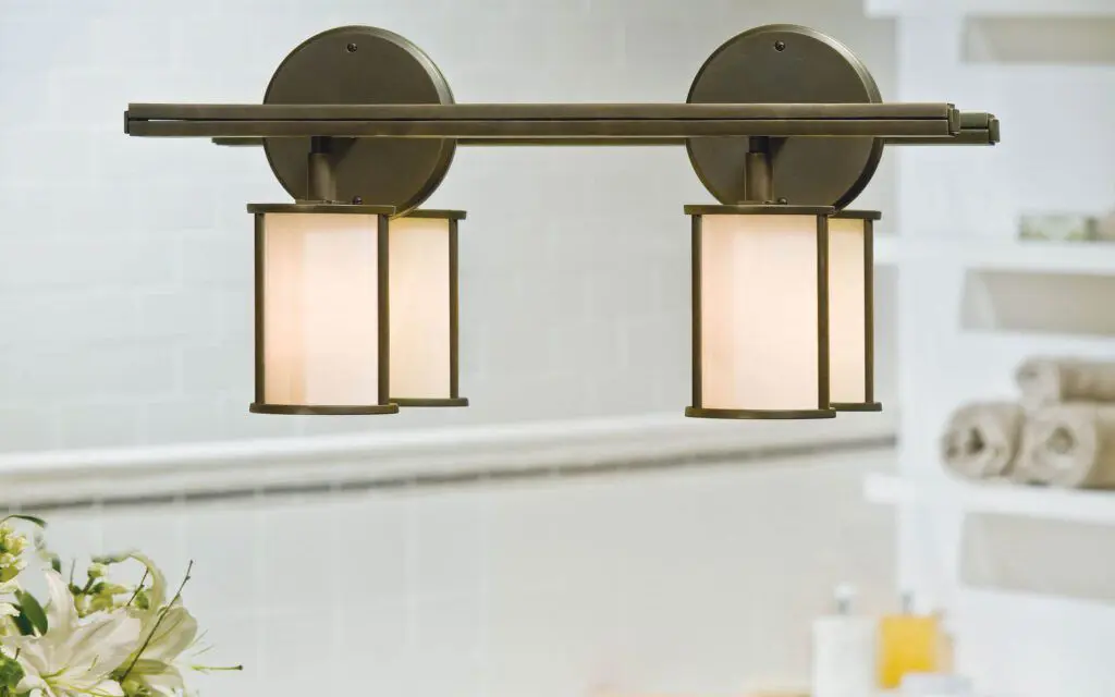 Lantern vanity (V455-26) with Round escutcheons (E419), shown in silicon bronze, dark patina.