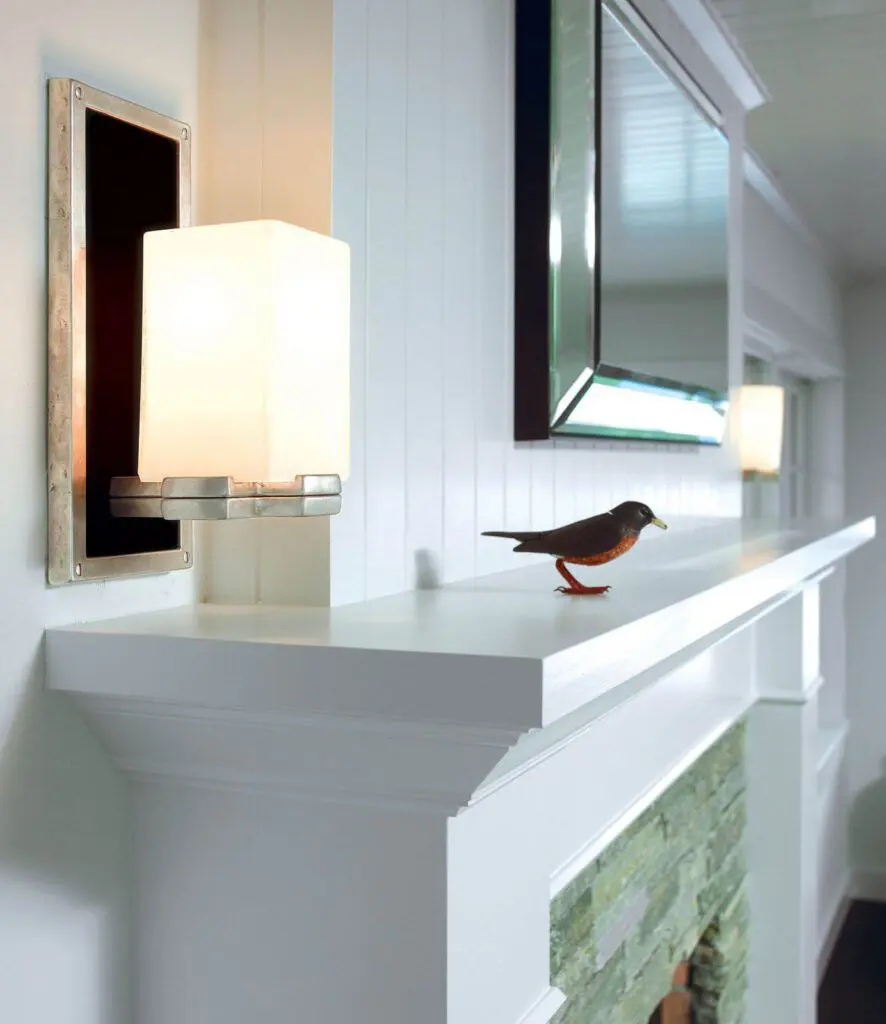 Truss sconce (WS416) with Rectangular Designer escutcheon (G153) and square globe (004), shown in white bronze, brushed patina.