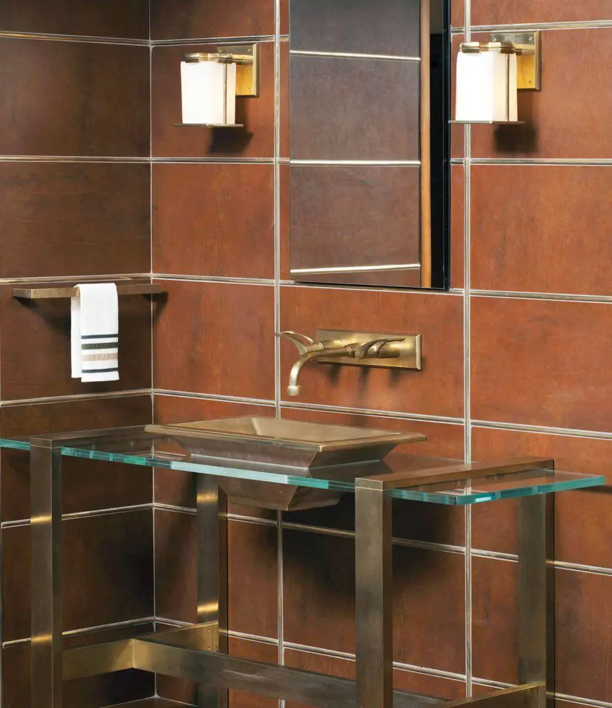 The Echo Sconce (WS590), Quadra sink (SK422), Lav. Deck Mount Faucet (DMF) with Small Olympus levers (LB60) and the Rail towel bar (TB5) shown in silicon bronze, light patina.