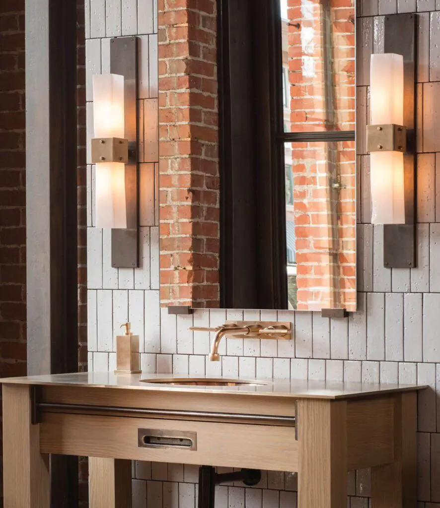 Shown is the Double Charlie Sconce (WS423) in white bronze, medium patina, the Wall Mount Faucet (WMF) with the Mini Olympus lever (LB60) and the Soap Dispenser (SP100) shown in silicon bronze, brushed patina.