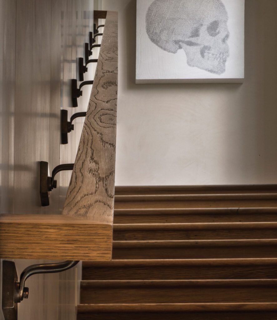 Handrail brackets (HB) with the Stepped escutcheons (E300), shown in white bronze, light patina.