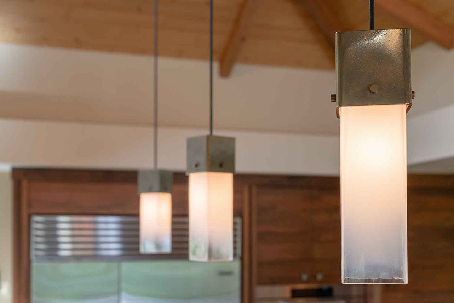 - Double Cube chandelier with flat box (C405FB) and the Charlie Pendant (PE435), both shown in silicon bronze, light patina.