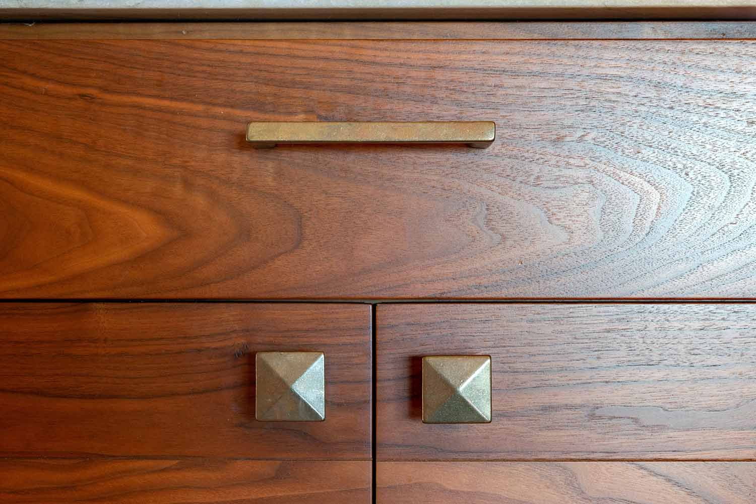 - Rail cabinet pull (CK260) and Luna cabinet knob (CK240) shown in silicon bronze, brushed patina.